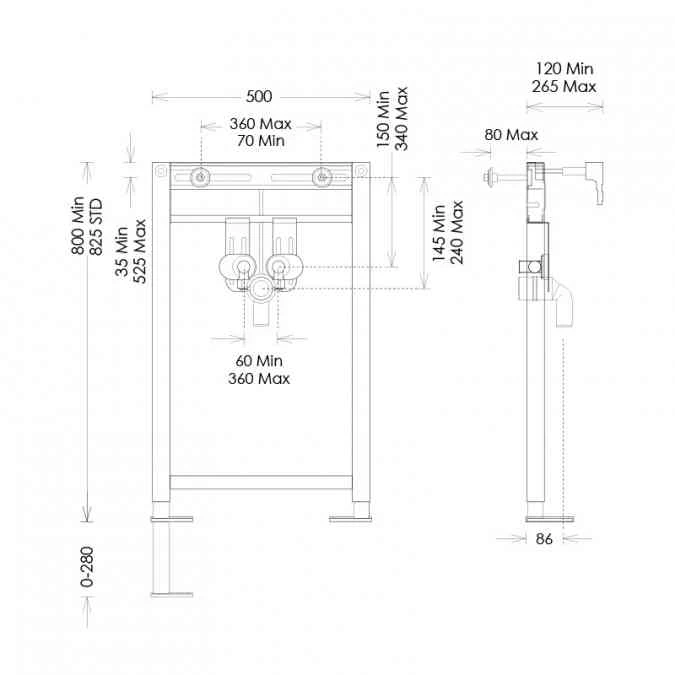 This Abacus Direct Easi Plan Basin Frame can be adjusted from 820mm to 980mm by extending the feet and adjusting fixing and connection points.