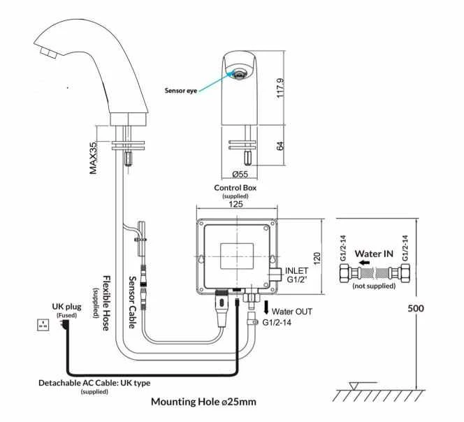 - Minimum pressure required: 0.5 bar