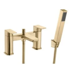 The Buff brushed brass deck mounted bath shower mixer tap . This product comes with a 3 year guarantee on valves and a 5 year guarantee on the body and finish.