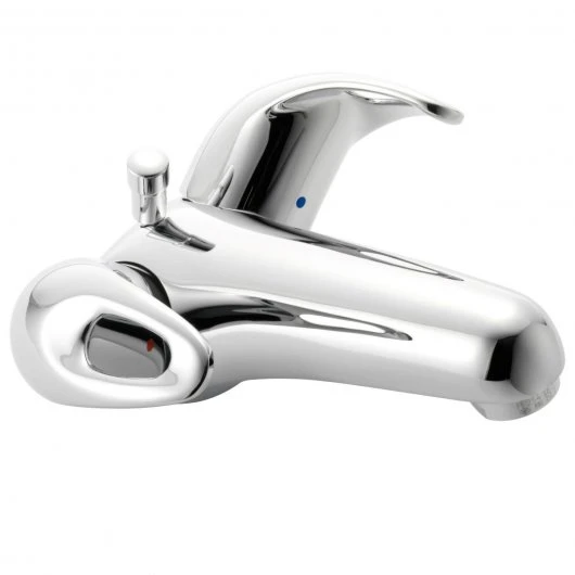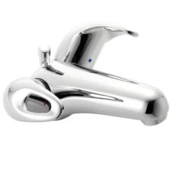 The Francis Pegler Izzi Monobloc Basin Mixer uses a familiar design for the spout but a unique set of handles that curve around towards the user.