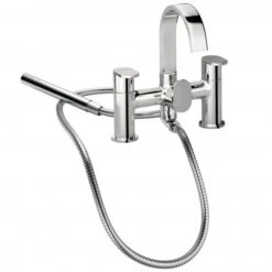 The Francis Pegler Strata Blade Two Hole Leg Bath Shower Mixer is the same as the Strata Blade Bath Filler made with brass and chrome but comes with an additional control in the centre to divert between the bath spout and the hose and attached shower head that is included in this package.