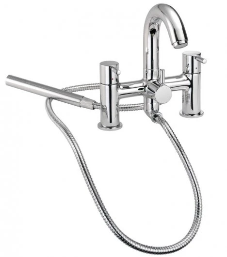 The Francis Pegler Visio Two Hole Leg Bath Shower Mixer is a full unit with a central bath spout in the middle of the unit with two temperature controls on either side. In the middle is a hose that is connected to the included shower head with a control to swap between these two functions.