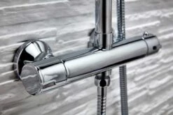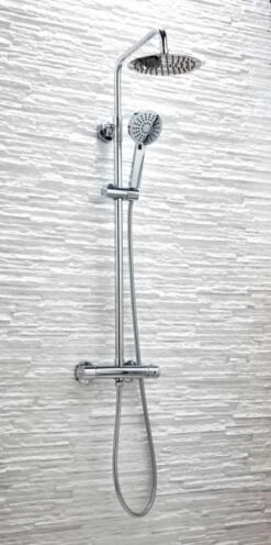 The Serena Formally know as Kate Round Rigid Riser Shower is a duel head exposed bar mixer shower with an adjustable height ultra slim metal, not plastic, drench head and adjustable slinding hand set.