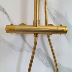 This eye-catching Ripley brass twin shower is a contemporary shower that is guaranteed to add a distinctive feature to your bathroom or ensuite. Finished in beautiful brushed brass finish, this contemporary shower set that will increase the aesthetics of any bathroom or ensuite.