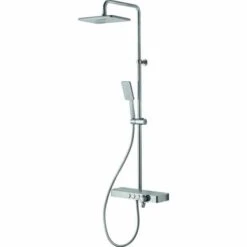 The Vema thermostatic shower comes with an external bar valve with diverter, a fixed overhead shower and rail kit with handset.